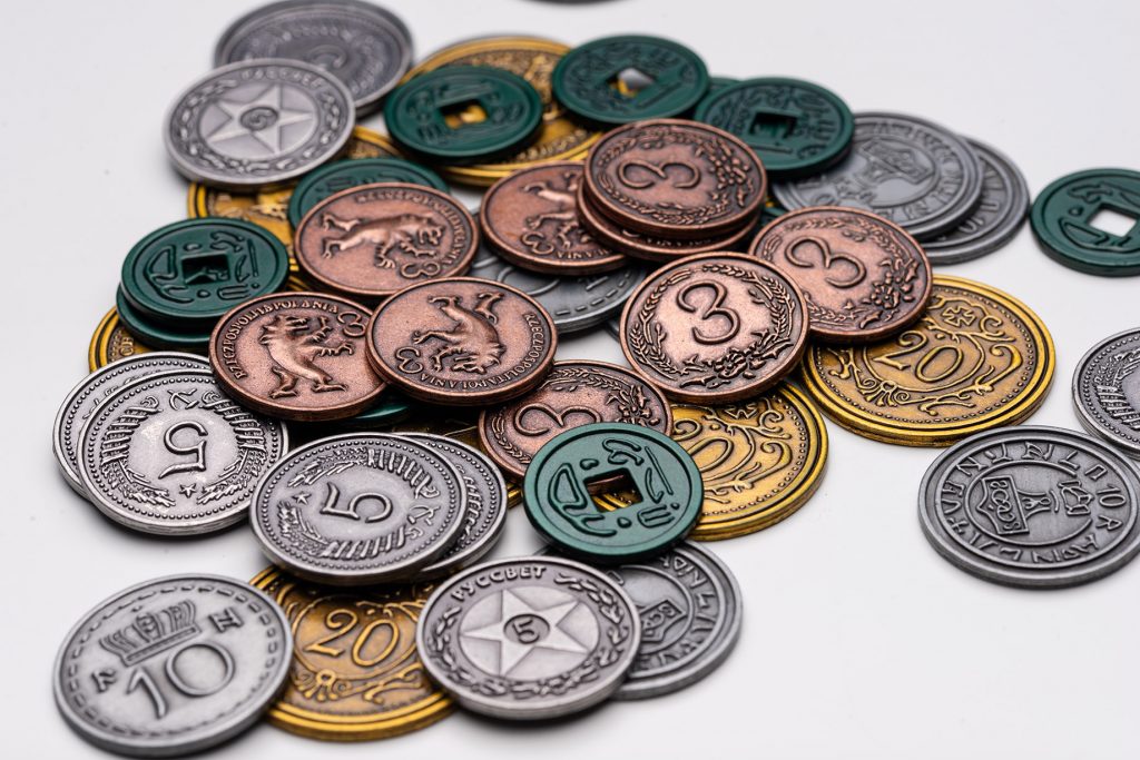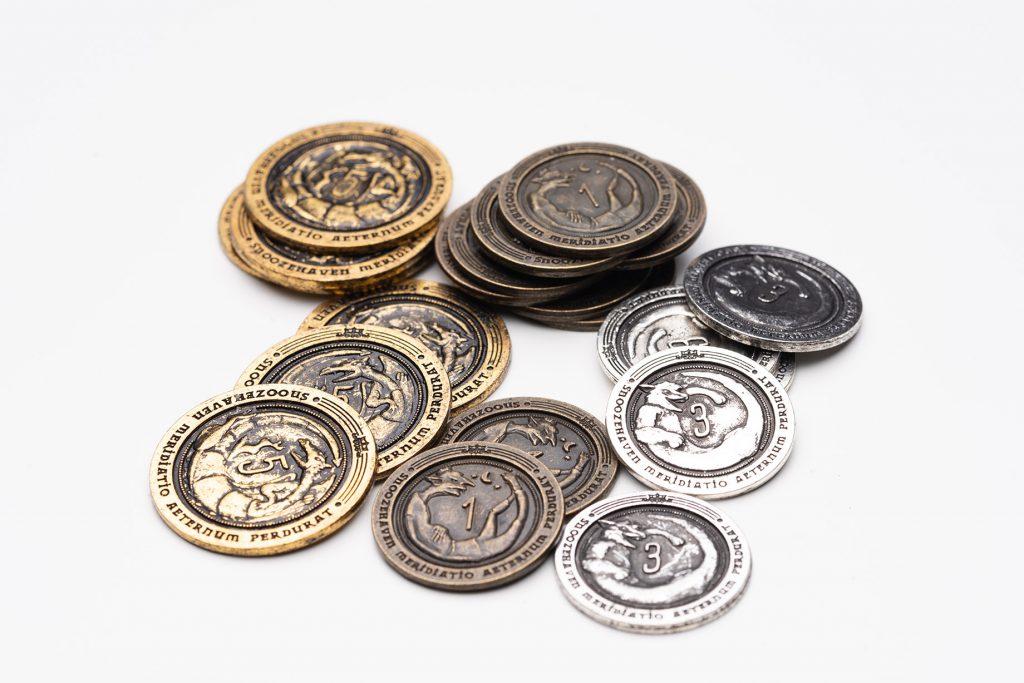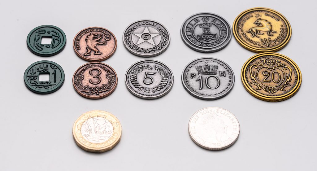 With coins we have a lot of options. First off there’s specific coin sets made for particular board games. These tend to be themed based on the game, but if you’re not fussy then they will make a good substitute for any game currency. One of the easiest to get a hold of is the coin set for the board game Scythe by Stonemaier Games. This set has a different style for each denomination of coin and a five different denominations, making it an ideal set as a generic currency replacement. Other notable mentions are Viticulture, Clans of Caledonia, and Brass.
