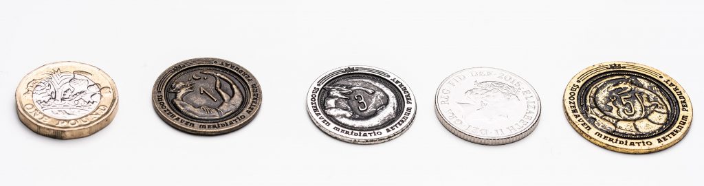 Of course the cheapest way to get metal coins would be to use actual money and some imagination. You can easily get a stack of pennies and other small coins to represent the monetary values in game, but then where’s the fun in that? Also, here in the UK you might not have noticed but the coinage has the values spelled out rather than a nice clear number nowadays.