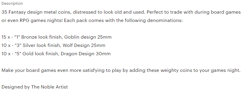 If you’re after more information on different sets of coins you can buy, I came across a blog of someone who has invested a lot of time and money into their coin collection as they like to assign different coins to particular board games. You can find Luke’s blog at pixelartmeeple.com.